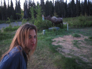 And see that lovely lady in the lower photo? That's Kristie, and her new friend the moose, taken from the back porch of our apartment. Remember the story about last weekend at Hooligans and Riverside? Well, after a few drinks, apparently Kristie thinks that getting close to a moose is a friendly thing to do in Alaska. I can't really blame her, because our moose friend certainly doesn't respect our property lines.